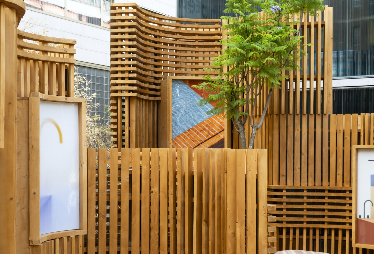 Benedetta Tagliabue describes Nutura as “a place that can be enjoyed from the inside and the outside, a place of peace and rest, built with natural elements and discovered little by little.” The pavilion’s undulating wooden and ceramic walls integrate seamlessly with Roca Gallery’s existing bamboo garden. Wooden lattices create varying levels of transparency resulting in a play of lights, shadow and texture, creating an overall sense of wellbeing and Mediterranean living. The pavilion’s floor is decorated with ceramic tiles in muted shades of blue and brown with allegorical drawings by Benedetta Tagliabue – EMBT Architects of Roca’s latest collections. These two collections lend their name to the pavilion: the Nu faucet collection, designed by Inma Bermúdez; and the Tura bathroom collection by Andreu Carulla.