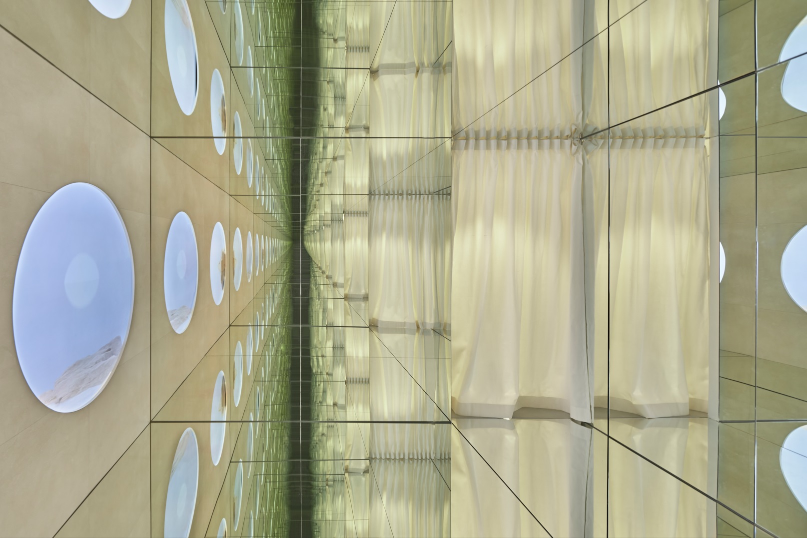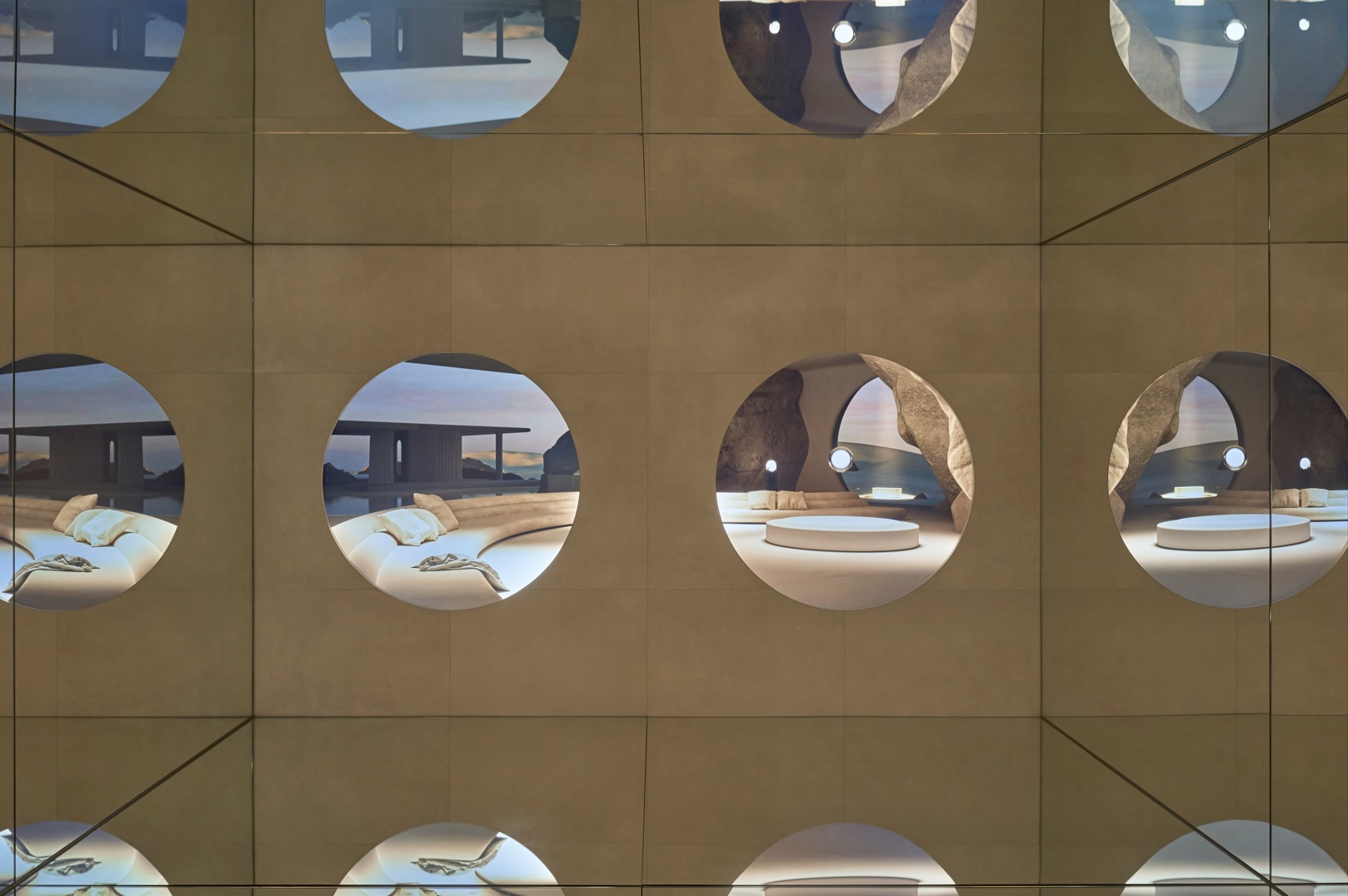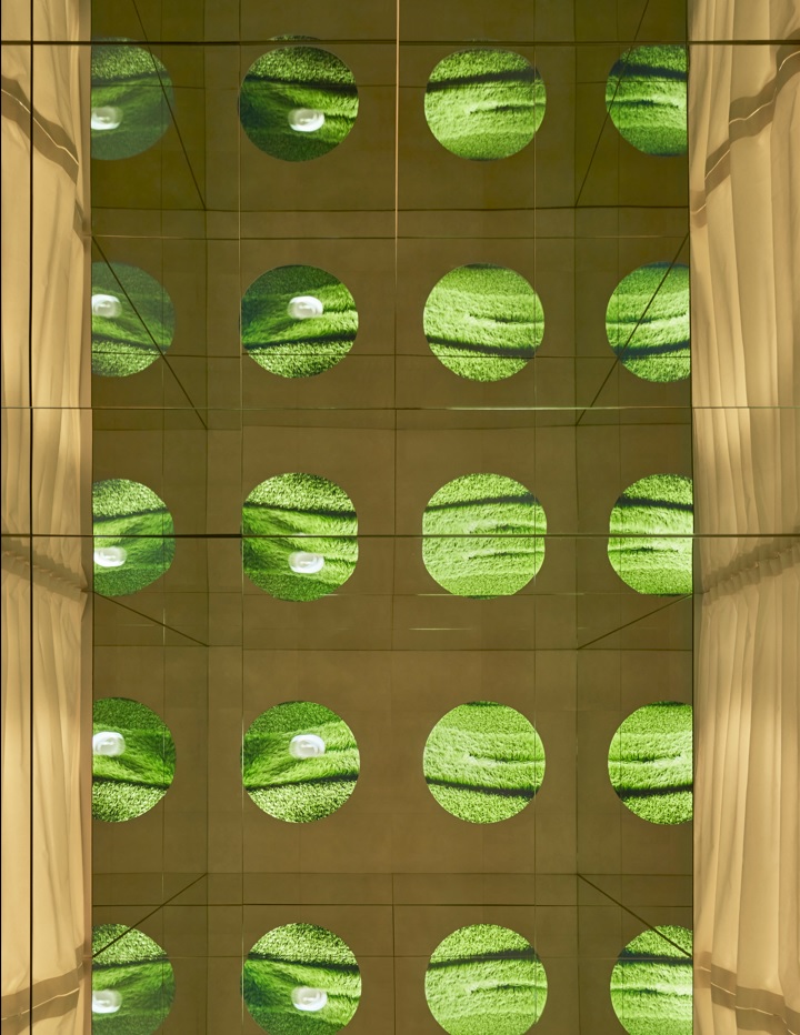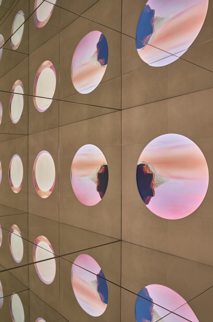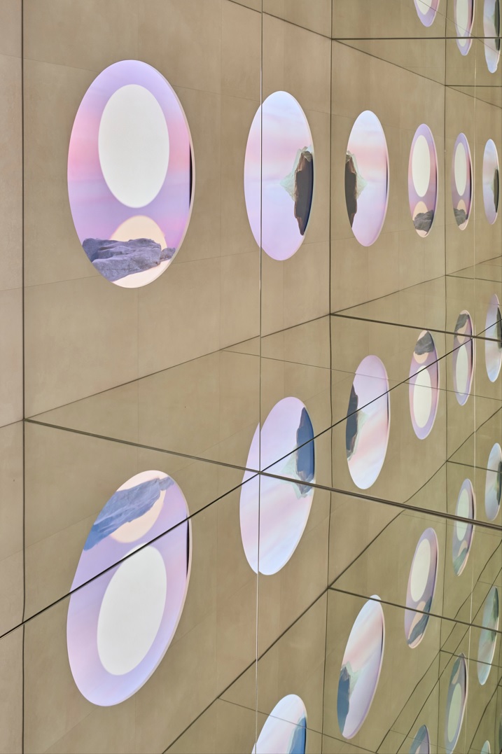 The space is based on the circular element, a metaphor for a drop of water, as a union between the physical and the ethereal, and raises the vision of a new world through a sensory journey, made thanks to the audiovisual piece created by the artists Julia Ippolito and Joe Mortell under the artistic direction of Isern himself and Aasheen Mittal.