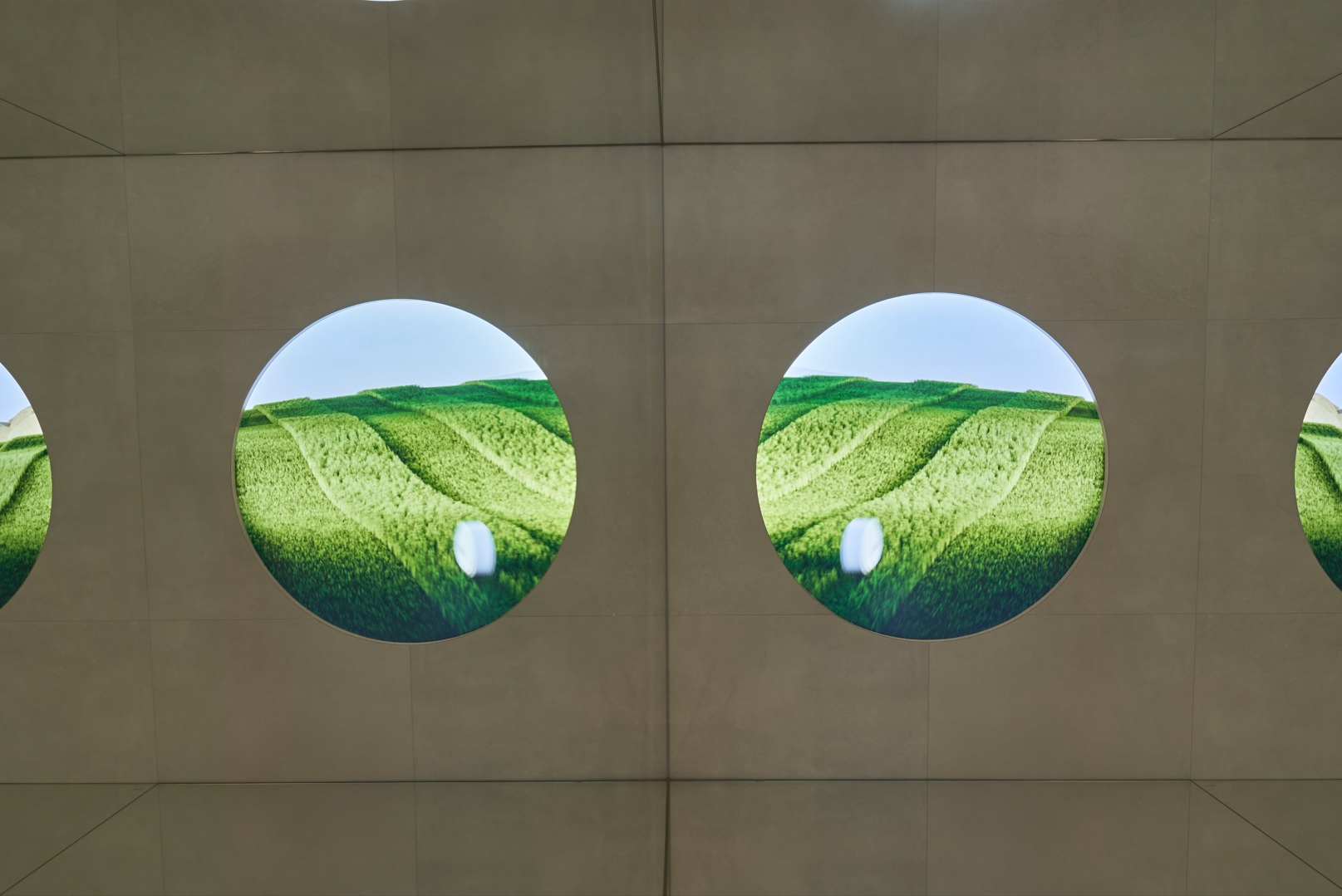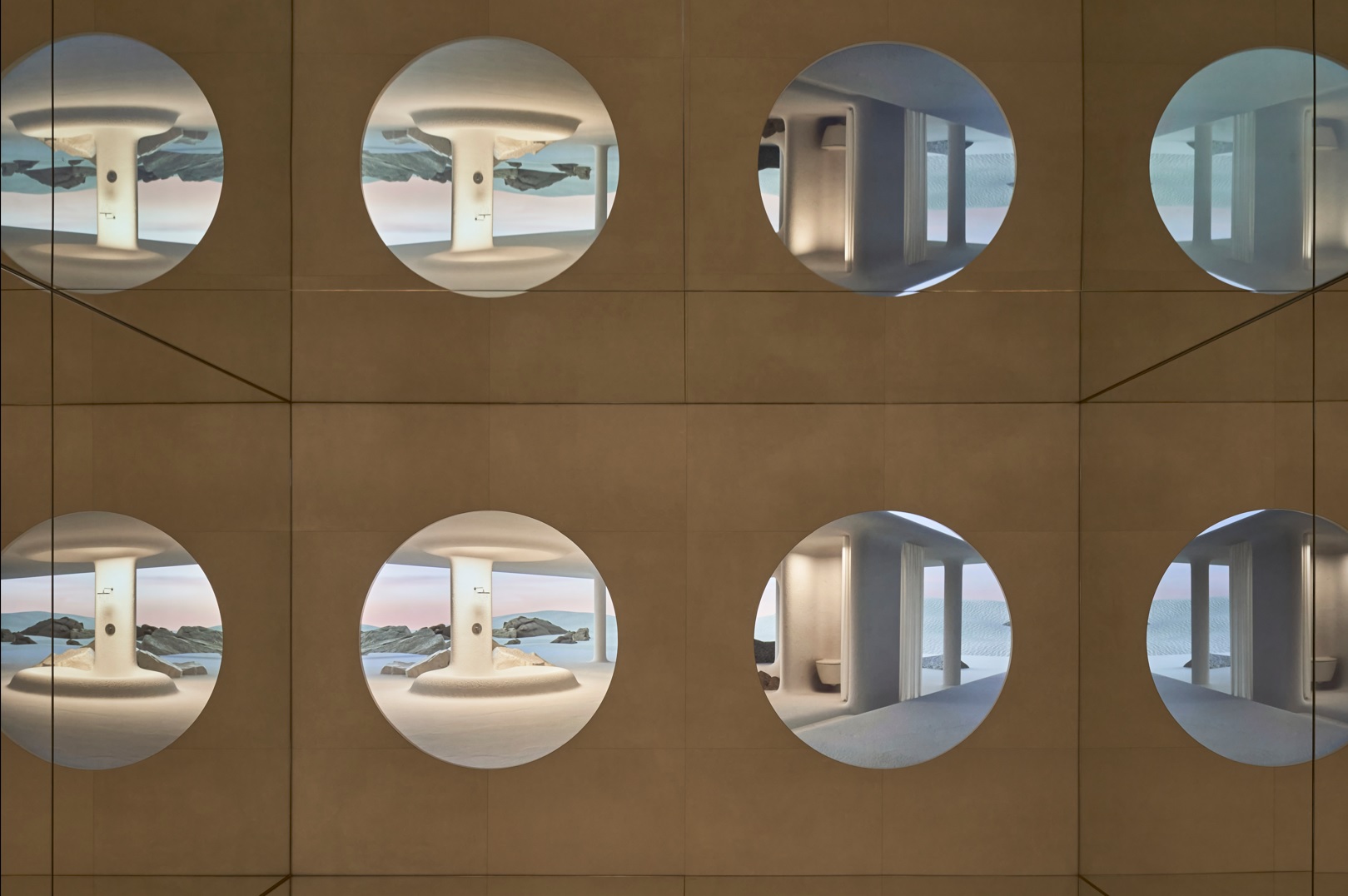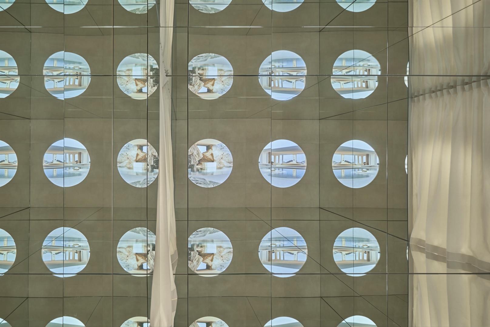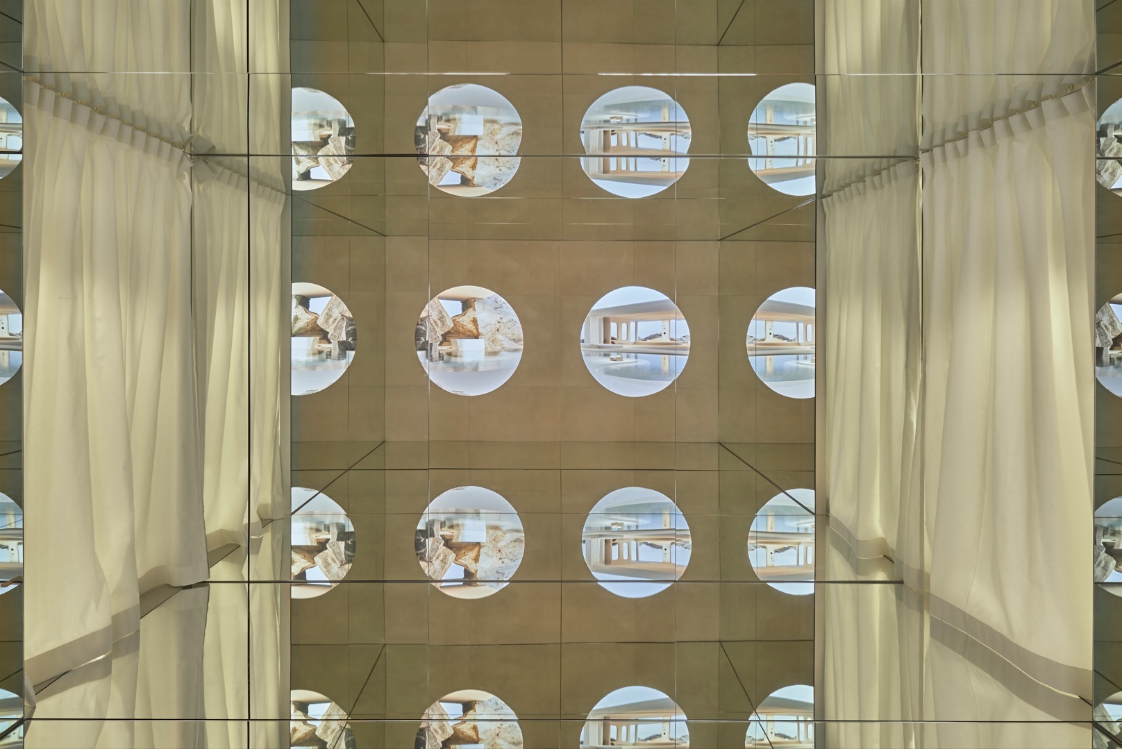 The space is based on the circular element, a metaphor for a drop of water, as a union between the physical and the ethereal, and raises the vision of a new world through a sensory journey, made thanks to the audiovisual piece created by the artists Julia Ippolito and Joe Mortell under the artistic direction of Isern himself and Aasheen Mittal.