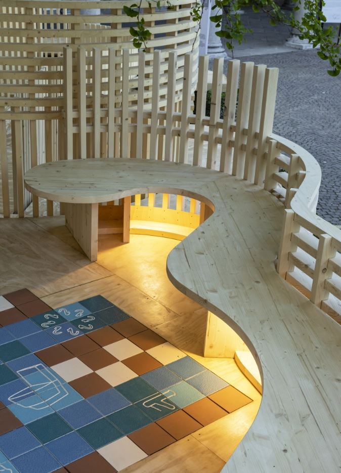 The organic shapes and the combination of neutral colours, from the different tones of brown to the various shades of blue, are reminiscent of the land and the sea. “Echoes of the Mediterranean”, Benedetta Tagliabue says, “elements of nature with which visitors slowly interact”.