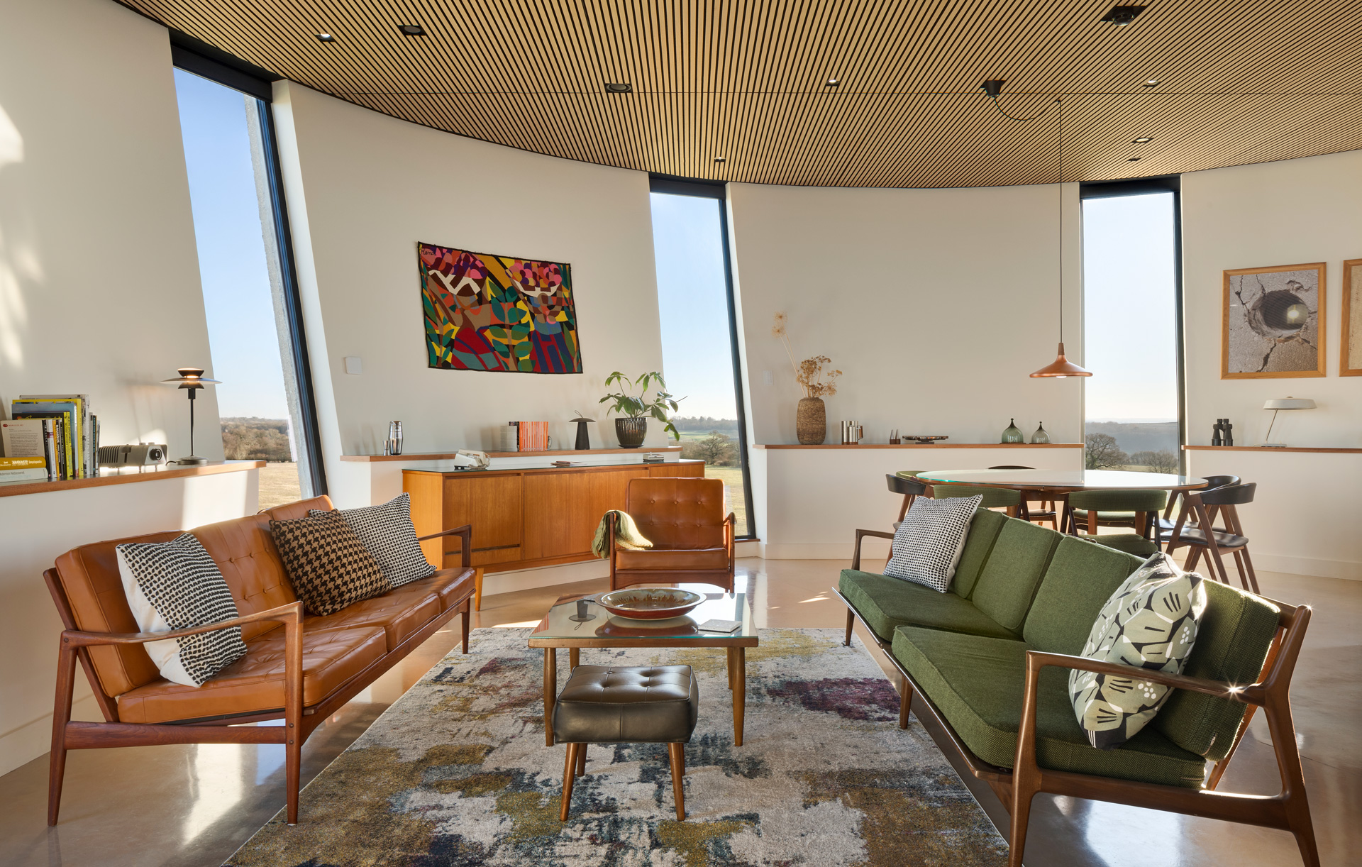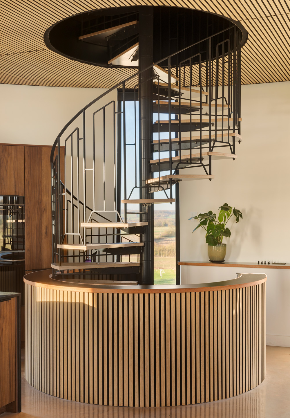 Located in Hertfordshire, just 30 minutes from London’s St Pancras, the 23-meter boutique retreat, comprises over 160 square-meters of living space across multiple levels, accessible by two hand-built spiral staircases. The renovation preserved the tower’s brutalist heritage while infusing it with modern design, energy efficiency, and multi-generational usability. With restored Danish and British furniture and cabinetry, the tower's interiors embrace comfort, design, and purpose. The conversion also complies with current environmental standards, including BREEAM certification.