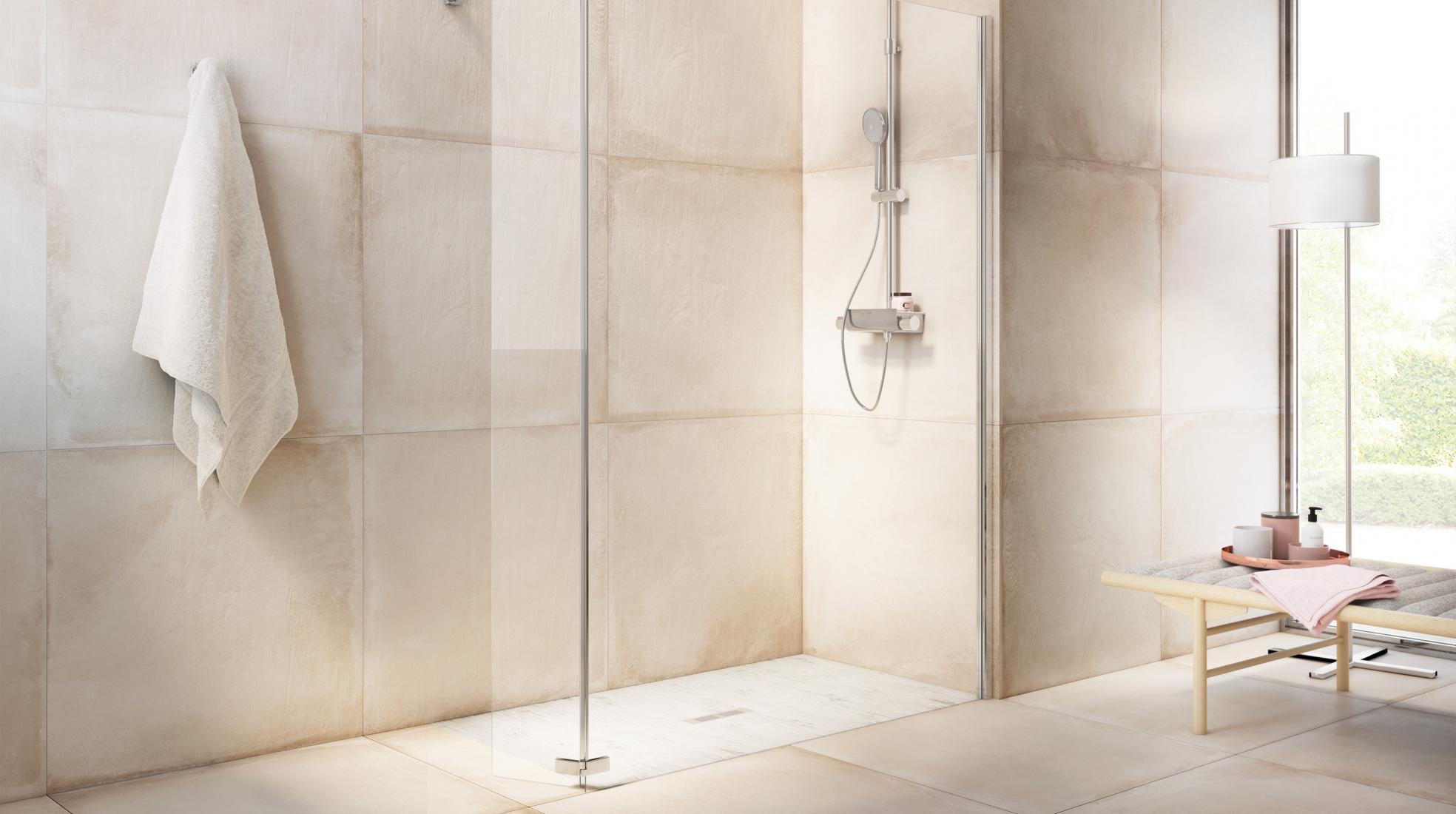 To achieve a sophisticated and even integration, the drain grid of the Helios collection is manufactured in stainless steel and coated in a finish matching the colour of the shower tray.