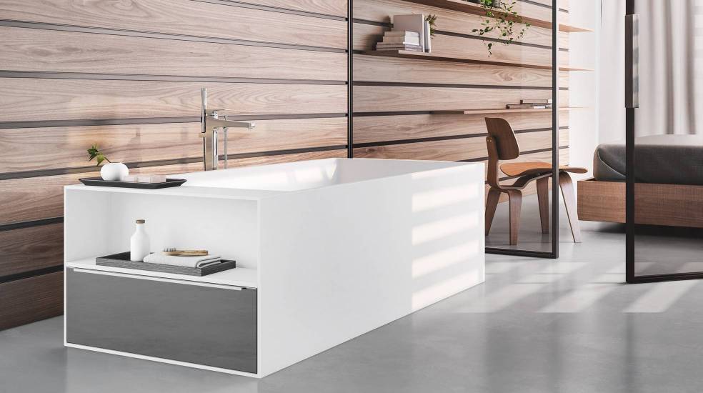The passion for volumes defines one of the most charismatic pieces of this innovative collection. Available in 1800×800 mm and 2000×800 mm, the Modo baths provide extra distinction to the bathroom space. Moreover, its larger model includes a drawer and a shelf on one of its sides, thus increasing the storage space in the bathroom.