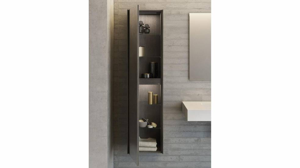 The entire collection has been conceived to guarantee the maximum comfort and quality, the drawers being an example, with a full extraction system and an interior divided into compartments with a textured finish in dark wood, very pleasant to touch, and a soft-close and silent system; or the column units, which feature internal lighting, glass shelves and full body mirror.