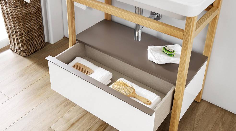 In its two available lengths -650mm and 850mm-, the unit features a towel rail under the basin, resting on four quadrangular legs. The contrast with natural wood is brought by an ample white shelf, in which you can decide to continue recalling nature by placing plants or inspirational elements on it.