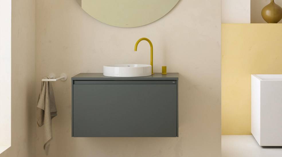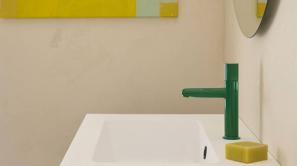 (Pictured: Nu basin mixer with deck-mounted lateral Stripes handle in honey yellow finish, and Ona base unit for over countertop basin with one drawer, in matt green finish)
