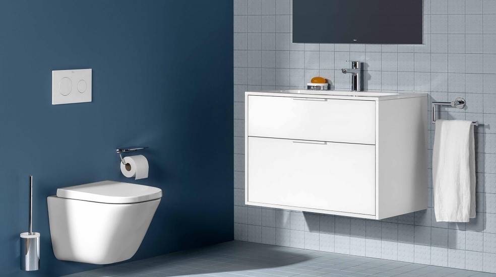 (Pictured: Optica base unit with two drawers in matt white finish and stonex® basin, Cala S-Size faucet in chrome finish, The Gap Square Rimless wall-hung WC, and Hotels accessories chrome finish)