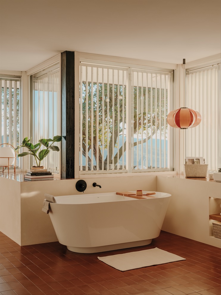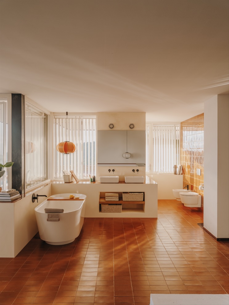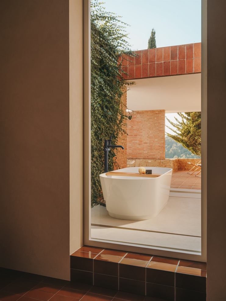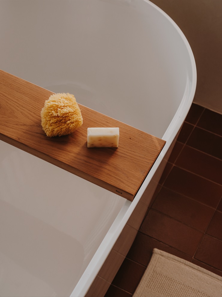 The Tura bathtub is at once voluminous and light, and its ergonomic design is meant for rest and relaxation. Its unique stacking shape is inspired by an architectural cantilever system, giving the impression that the bathtub is floating in space. It is made with Stonex®, an innovative material that allows for very precise shapes along with thin and linear forms that made it possible to create a subtle edge along the rim of the bath to hold the wooden shelf in place.