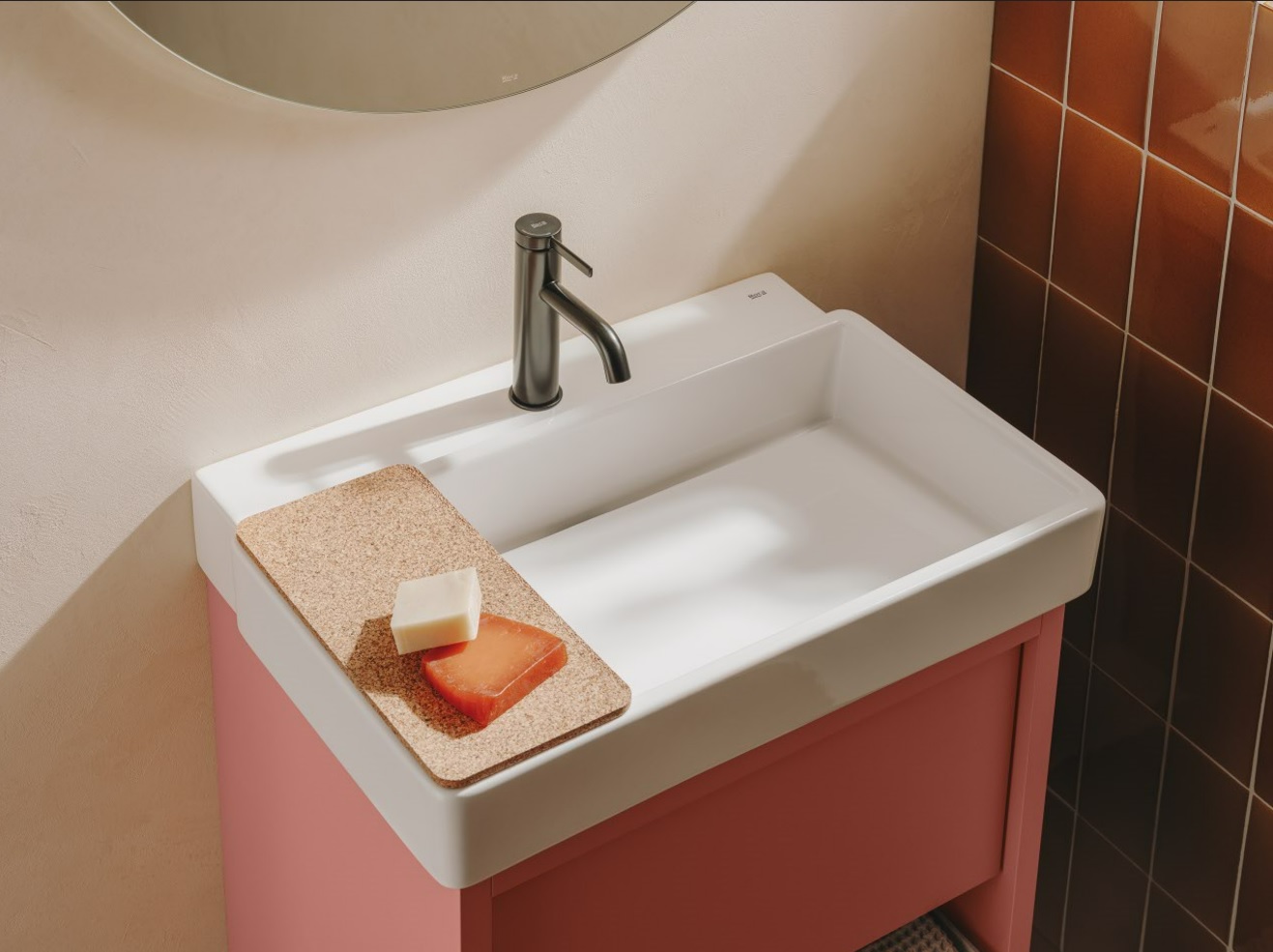 The felt storage boxes are lightweight, sustainably made and available in two different sizes. Their recycled cork lid can serve as a shelf on top of the washbasins.