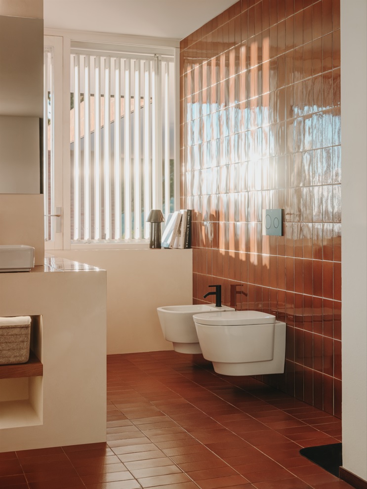 The play of shapes and voids on the toilets and bidets gives the impression of looking at small ceramic buildings as seen from above. Available in wall-hung, floor standing, closecoupled models, they are designed to blend discreetly into the bathroom space.